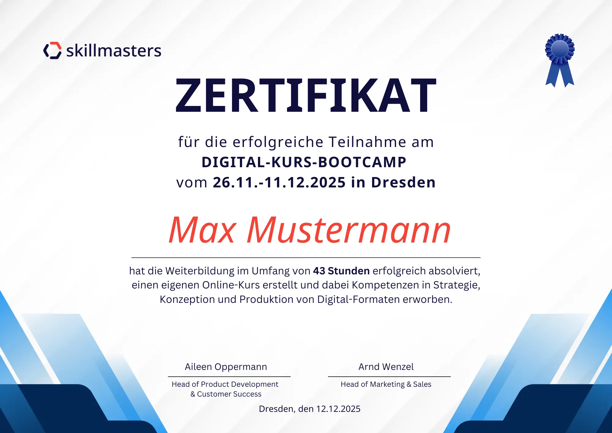 Unser nächstes Digital-Kurs-Bootcamp findet vom 4. bis 7. Dezember 2025 in Dresden statt.